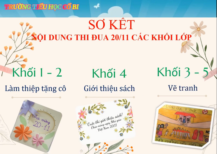 Ngay sau tiếng trống khai giảng đón chào năm học mới cất lên, trường Tiểu học Cổ Bi đã dấy lên phong trào thi đua sôi nổi giữa các tập thể, các cá nhân học sinh trong nhà trường, gắn liền với hoạt động dạy và học trong đợt thi đua thứ II với chủ điểm “Biết ơn thầy cô giáo” chào mừng ngày nhà giáo Việt Nam 20/11. Ban thi đua nhà trường tuyên dương các tập thể, cá nhân đã tham gia các nội dung thi như: Vẽ tranh, làm thiếp, giới thiệu sách. Các bài dự thi của các con học sinh đã được ban thi đua nhà trường đánh giá cao với nội dung ý nghĩa, hình thức đẹp, phong phú và tính sáng tạo cao.Tiêu biểu ở nội dung thi vẽ tranh là của các bạn học sinh: Đoàn Nguyễn Bảo Châu 5B; Bùi Tuệ Minh 5B; Thùy Dương 3A; Trịnh Phương Anh, Tố Quyên, Hoàng Trung 3C… và nhiều bạn học sinh khác cũng có những bức vẽ đẹp truyền tải được hết thông điệp chủ đề của bức vẽ. Nội dung thi giới thiệu sách các lớp mỗi cuốn sách đều có ý nghĩa hay và hình thức phong phú tiêu biểu là nội dung thi giới thiệu sách của học sinh Nguyễn Doãn Long Giang - lớp 4B đã đạt giải nhất. Và đặc biệt là các con học sinh khối lớp 1 và 2 tuy nhỏ nhưng đã có các sản phẩm thiệp rất đẹp để tặng các cô nhân dịp 20/11 tiêu biểu và các con học sinh: Lê Thùy Chi – 1A; Nguyễn Ngọc Phương Uyên – 1E; Nguyễn Minh Quang – 2D…. Với những thành tích đạt được của các tập thể, cá nhân học sinh các lớp cô mong rằng trong các đợt thi đua tiếp theo sẽ có nhiều tập thể, cá nhân đạt thành tích cao hơn nữa.
